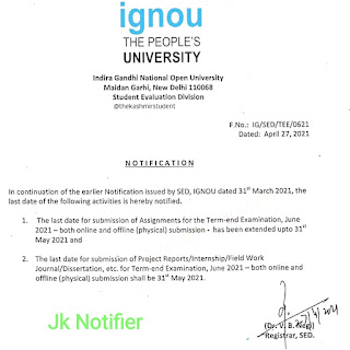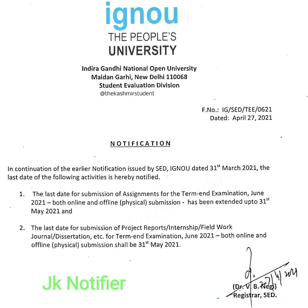 In continuation of the earlier Notification issued by SED, IGNOU dated 31* March 2021, the