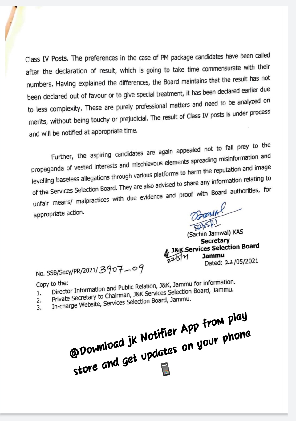 Jammu and Kashmir Service Selection board today on 22 May 2021 released a Press Notification regarding the Result of Class IV candidates.