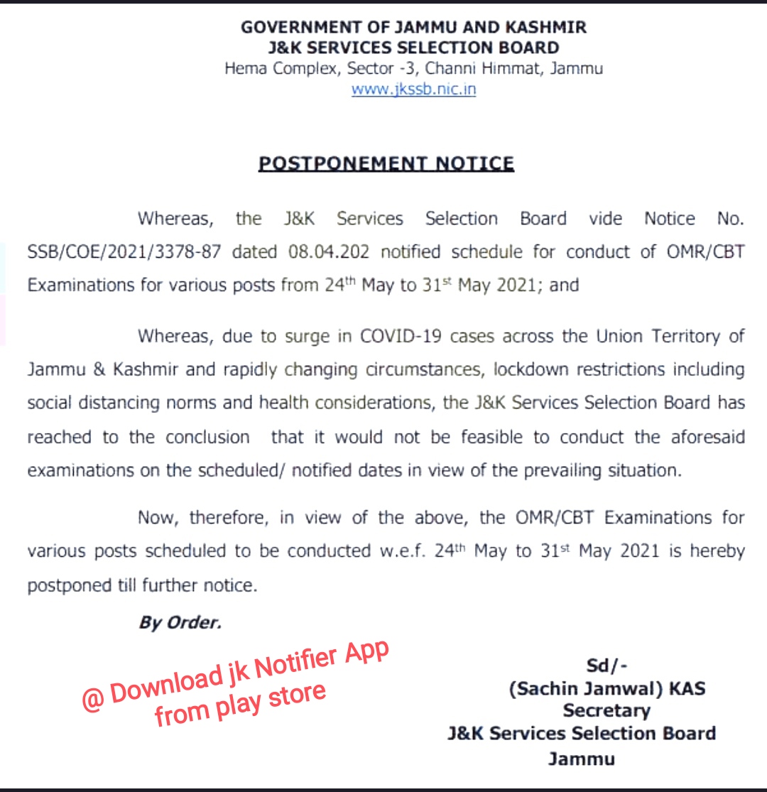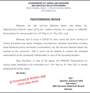 JKSSB Posponted Examinations for various posts scheduled to be conducted w.e.f. 24th May to 31st May 2021 is hereby postponed till further notice. JKSSB Postponed Notification.
